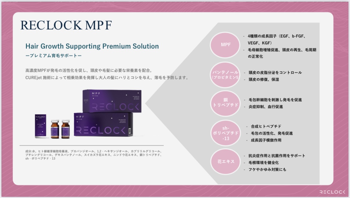 ・ReclockMPF:プレミアム育毛サポート製剤。発毛促進・大人の髪にはり、コシを与え、薄毛を予防します。